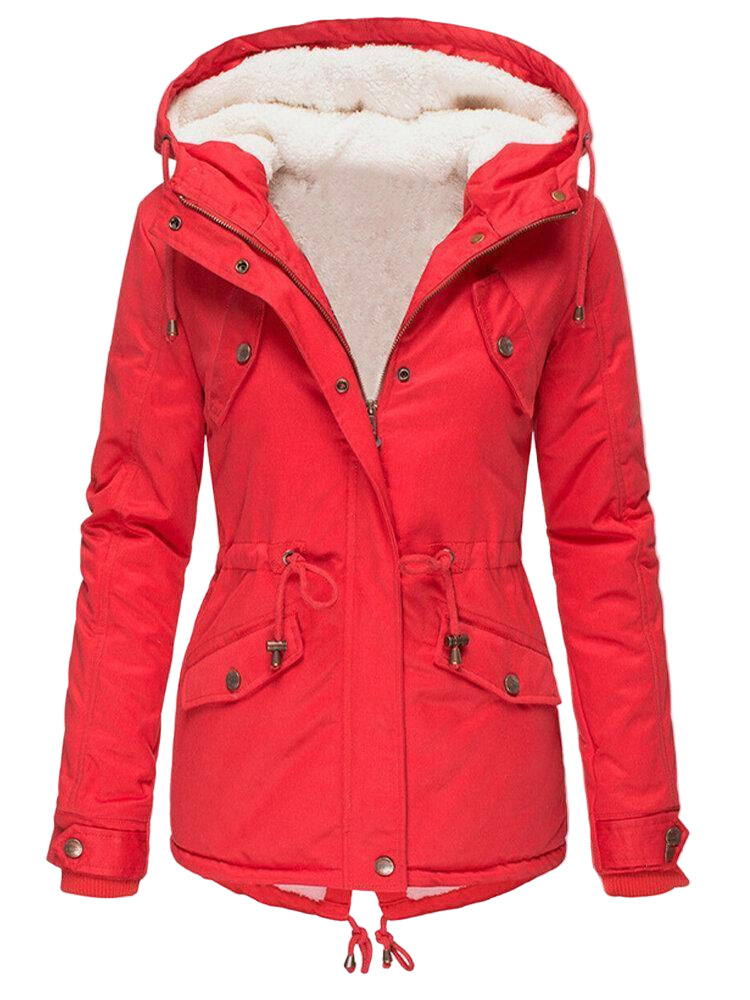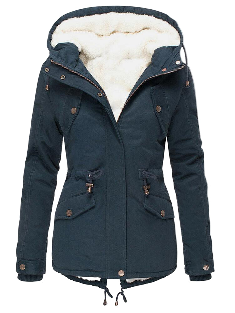 Ten płaszcz posiada zamek błyskawiczny na całej długości z przodu z dodatkową listwą guzikową dla bezpiecznego zapięcia. Sznurki w talii pozwalają na regulację, tworząc taliowaną sylwetkę. Fason zawiera odpinany kaptur i funkcjonalne kieszenie z klapami zapinanymi na guziki. Prążkowane mankiety na nadgarstkach dopełniają wyglądu. Ten płaszcz jest odpowiednim wyborem na chłodniejszą pogodę.