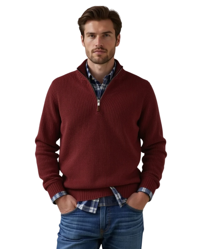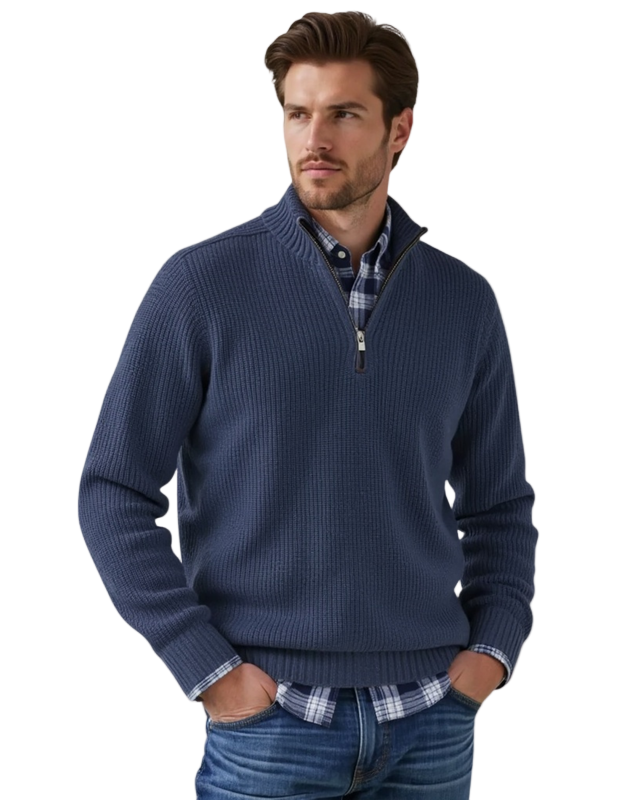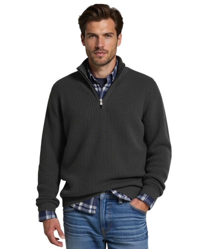 Ten męski sweter z zamkiem do połowy szyi posiada wysoki kołnierz i zamek z przodu, który biegnie częściowo w dół klatki piersiowej. Ogólny krój jest przeznaczony do regularnego, prostego wyglądu, co sprawia, że nadaje się do standardowego codziennego noszenia. Prążkowana tekstura na ubraniu dodaje wizualnego elementu do powierzchni tkaniny. Ten element funkcjonuje jako prosty sweter, dobrze komponujący się ze spodniami wizytowymi lub dżinsem zarówno do pracy, jak i na weekend.