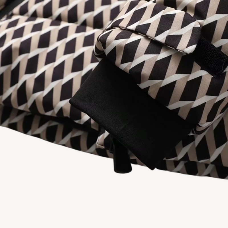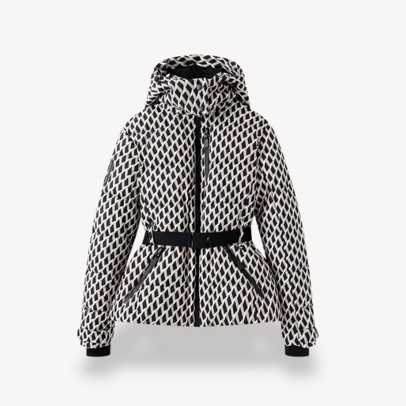 Puffer z Kapturem i Paskiem | Pikowana Kurtka we Wzór Graficzny dla kobiet
